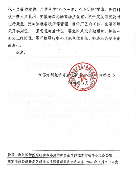 在前期的精心準(zhǔn)備下,我公司已于3月1日通過(guò)疫情防控、安全生產(chǎn)、環(huán)保生產(chǎn)三項(xiàng)驗(yàn)收,3月2日獲得復(fù)工批文并于今日正式復(fù)工。公司將強(qiáng)化底線思維,全面落實(shí)好國(guó)家和省、市、區(qū)防疫工作的相關(guān)要求。在扎實(shí)做好各項(xiàng)防控措施的基礎(chǔ)上,堅(jiān)決杜絕疫情的發(fā)生。