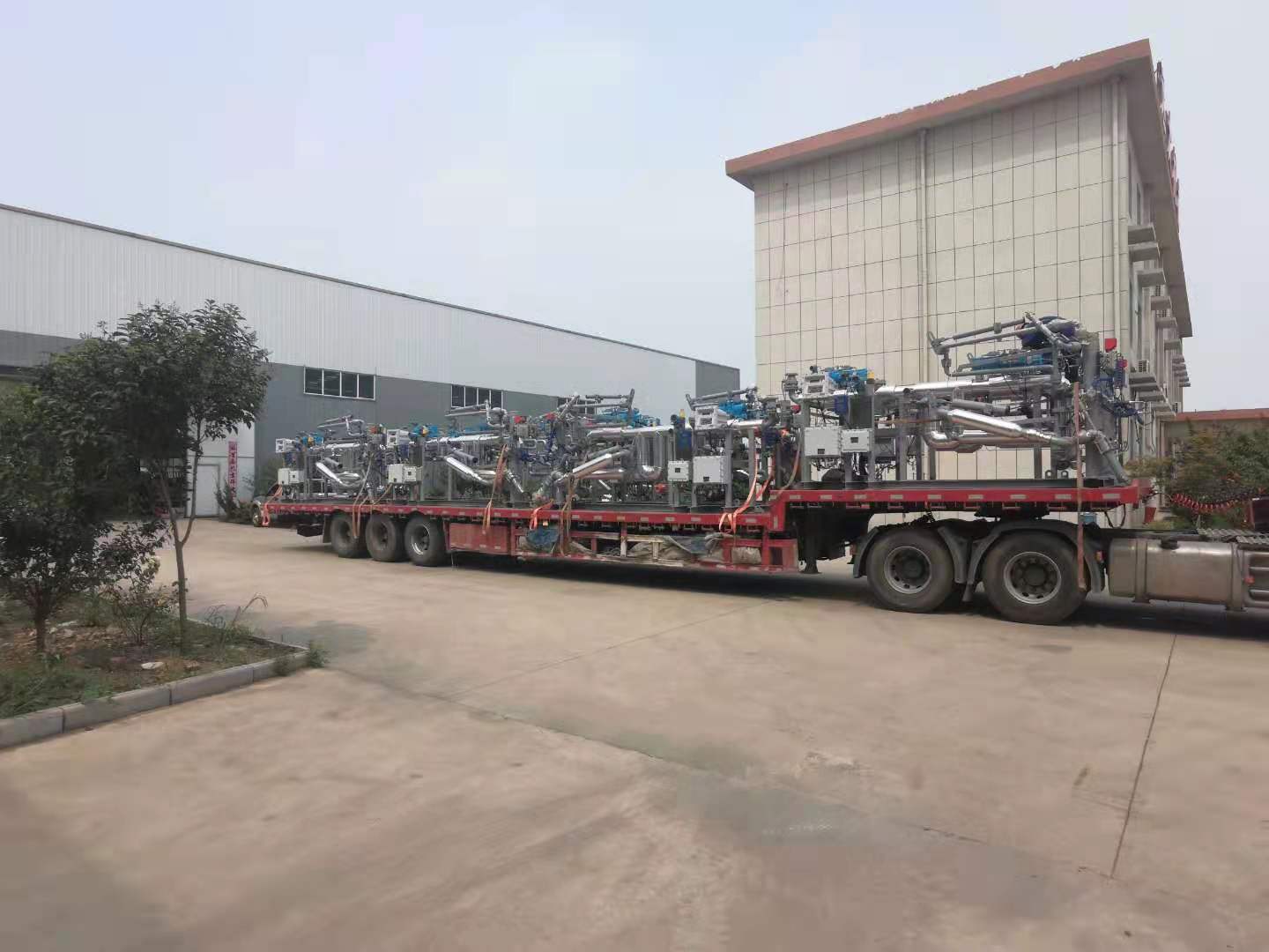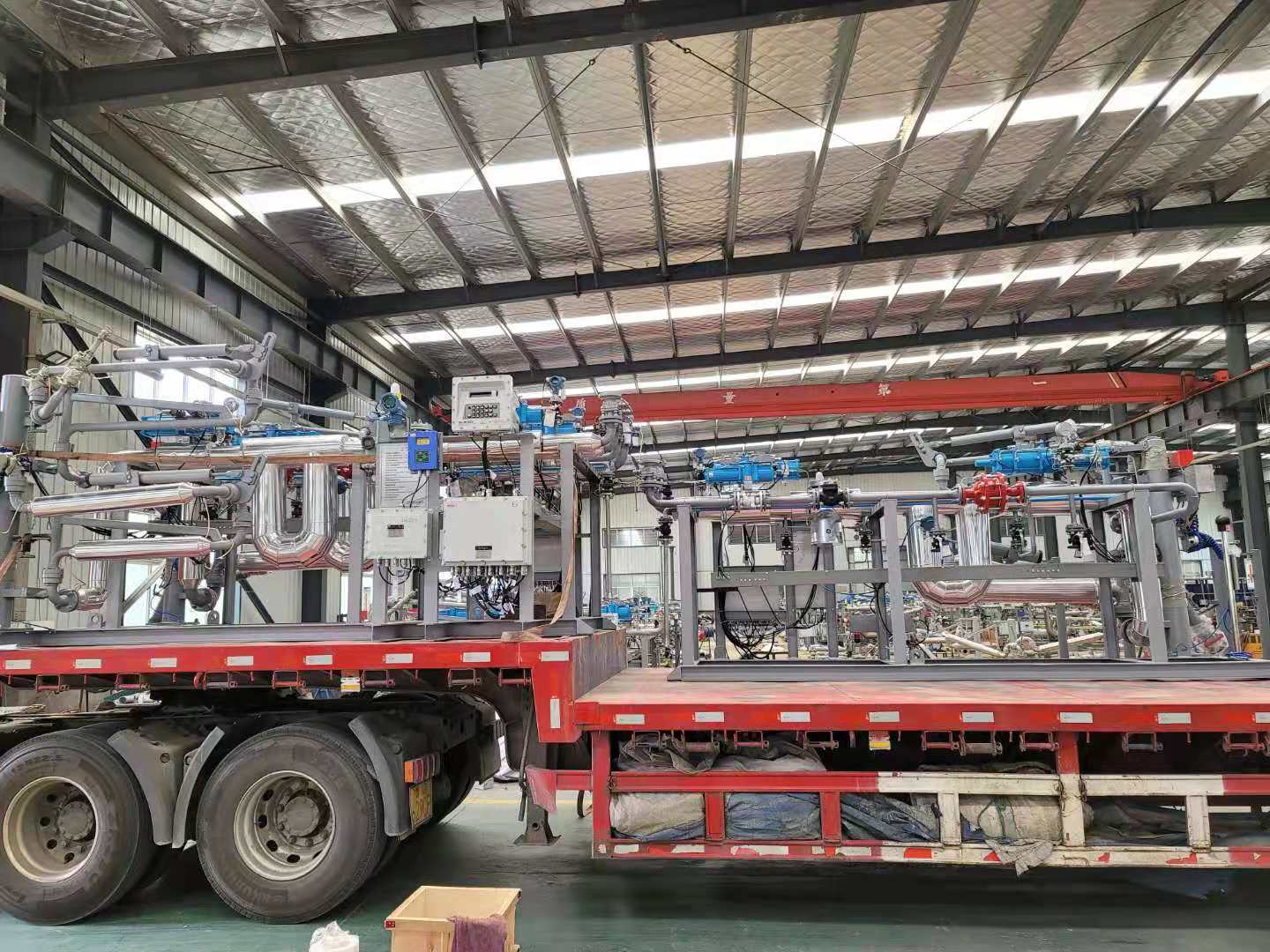 油品及化工品定量裝車(chē)橇裝組是指將每一個(gè)裝車(chē)鶴位內(nèi)的儀表和設(shè)備集成在一個(gè)專用的框架結(jié)構(gòu)內(nèi),儀表和設(shè)備包括裝車(chē)鶴管、流量計(jì)、防溢油靜電報(bào)警控制器、壓力變送器、裝車(chē)流量控制閥、緊急切斷閥,裝車(chē)泵、批量控制器等, 只預(yù)留工藝連接口和控制電源和通訊接口,這個(gè)整體集成部分稱為裝車(chē)橇。與傳統(tǒng)的裝車(chē)控制系統(tǒng)就地組裝比較,裝車(chē)橇可以節(jié)省現(xiàn)場(chǎng)設(shè)計(jì)和現(xiàn)場(chǎng)施工量,縮短項(xiàng)目工期,提高裝車(chē)控制系統(tǒng)的質(zhì)量。以下是近期公司定量裝車(chē)撬的生產(chǎn)及發(fā)貨現(xiàn)場(chǎng)。