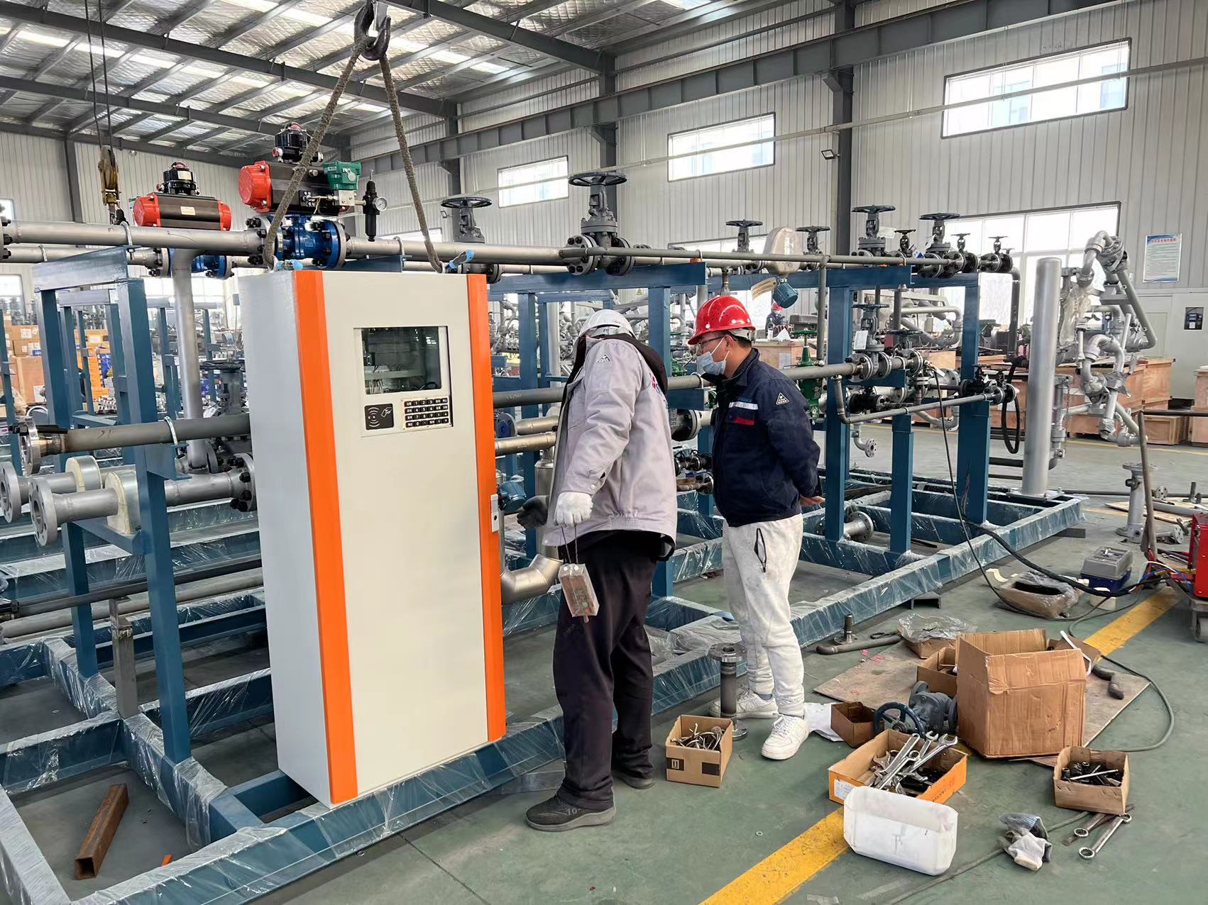 液化烴類介質(zhì)槽車裝車系統(tǒng)比油品槽車裝車系統(tǒng)復(fù)雜,現(xiàn)場(chǎng)組配裝車系統(tǒng),安裝和調(diào)試周期長(zhǎng),質(zhì)量不穩(wěn)定。為克服以上缺點(diǎn),在工廠內(nèi),將裝車系統(tǒng)的儀表和設(shè)備集成在一個(gè)橇裝架上,并完成電氣安裝、強(qiáng)度試驗(yàn)和低溫測(cè)試等,裝車橇到達(dá)用戶裝車現(xiàn)場(chǎng)后,接地角螺栓,連接工藝管線、通訊和供電線路就可以使用。結(jié)合液化烴類介質(zhì)裝車橇技術(shù)特點(diǎn),對(duì)液化烴裝車系統(tǒng)中的設(shè)計(jì)數(shù)據(jù)、功能要求、操作方法進(jìn)行敘述,綜合國(guó)內(nèi)裝車系統(tǒng)在使用中出現(xiàn)的問(wèn)題提出了解決辦法。以下為公司近期液化烴類裝車撬的生產(chǎn)現(xiàn)場(chǎng)。